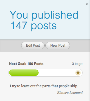 I don’t mean to nitpick though. On the bright side, this is the first time I’ve been able to actually use the little encouragement/goal-setting sidebar that shows up when you publish new posts. When I publish this post, for instance, it says I’ll be just three posts away from my 150 post goal. That’s kind of fun. I like it.
